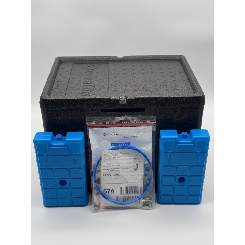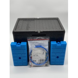 Ce kit comprend la glacière, 2 blocs eutectiques, le kit retour (Notice, boucle de cerclage, bon(s) de transport, étiquette à renseigner collée sur le couvercle de la glacière)